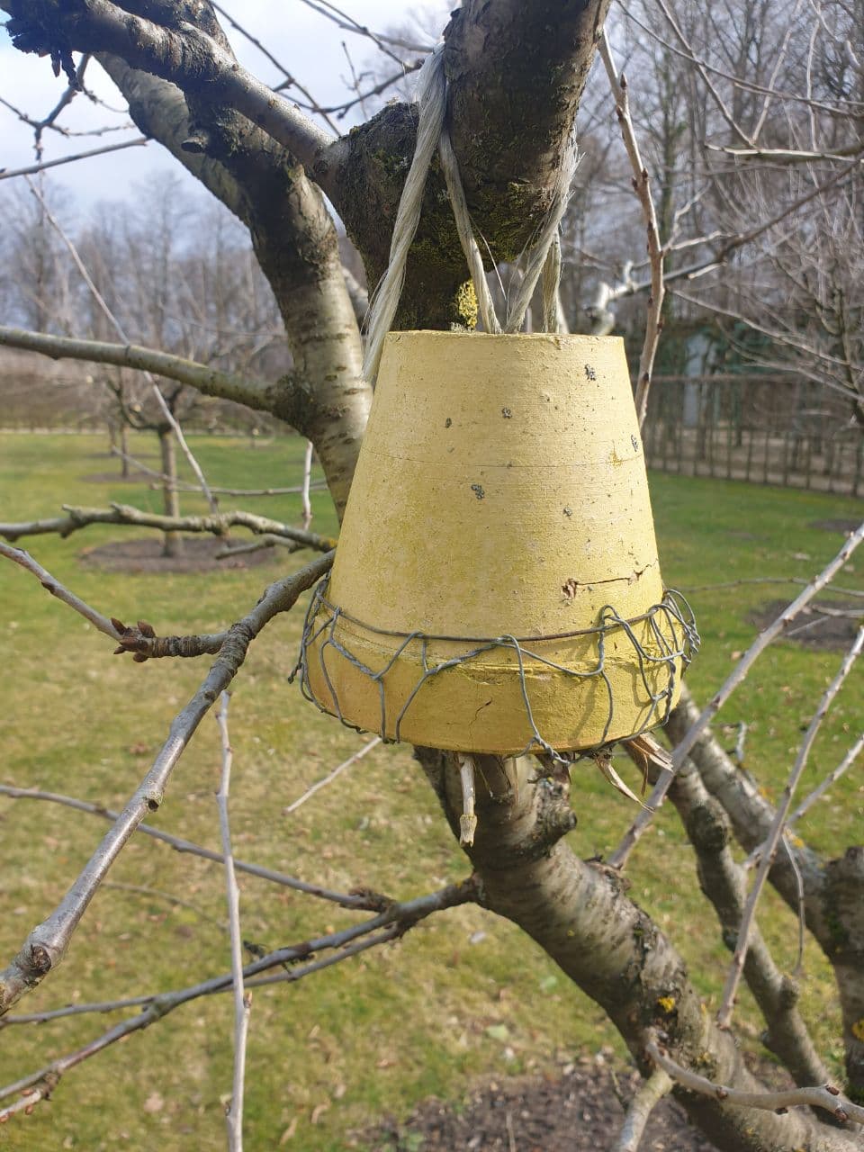 Ein häufiges Problem bei Süsskirschen ist der Blattlausbefall, besonders an den jungen Triebspitzen. Neben Kümmerwuchs, Wuchsdepressionen und Blattverformungen sind die Krankheitsübertragung ein Problem. Dagegen hilft, wie auf den Bildern zu sehen ein mit Stroh gefüllter Tontopf, in den sich die nachtaktiven Tiere zurück ziehen können. Wichtig hierbei, die Stammnähe als Garant für die Zugänglichkeit. Das Stroh mit Drahtgeflecht sichern und mit einem kurzen Strick am Baum befestigen.