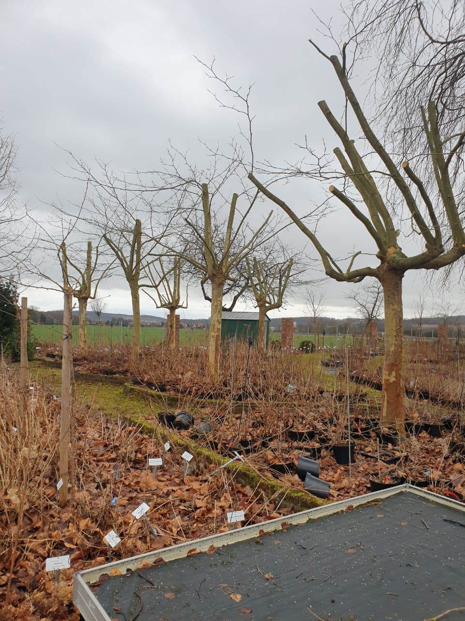 Die Platanen über den Verkaufsquartieren der amerikanischen Waldhortensien mussten dringend gebändigt werden. Sie warfen mittlerweile zu viel Schatten auf die angrenzenden Rabatten und die darunter befinliche Verkaufsware. Der Obergärtner hat sie daher auf ein mit der Leiter händelbares Maß abgesetzt. Einige Korrekturschnitte werden jedoch schon im Sommer notwendig werden. Langfristig sollen sich Schnittköpfe bilden von denen die einjährigen Ruten dann jährlich im Februar abgeworfen werden. Die ursprünglich als Dachplatanen gepflanzten Bäume überlebten vor ca. 12 Jahren einen starken Befall durch den Rindenbohrer. Einige Stammschäden von diesem Befall sind heute noch sichtbar.